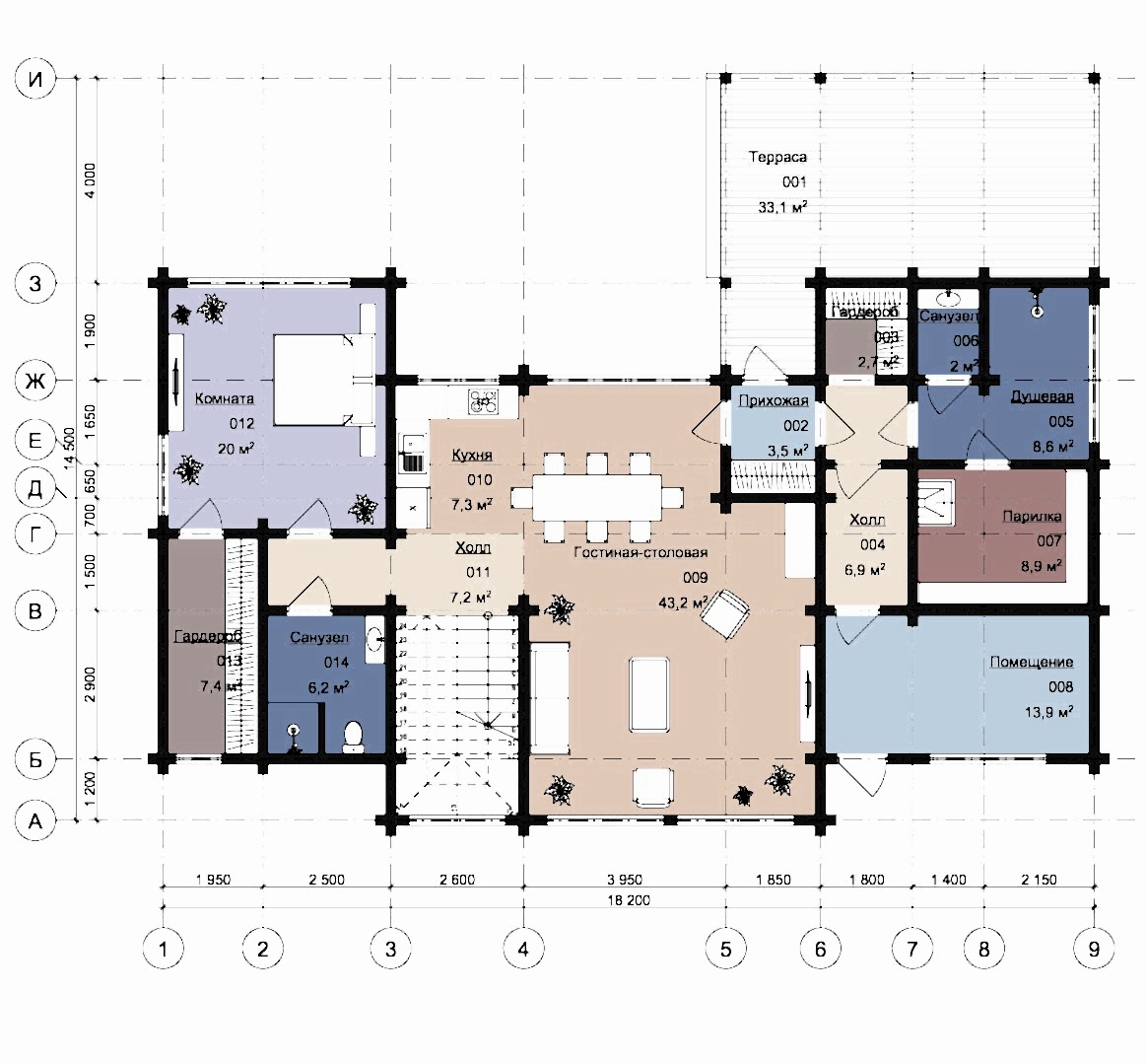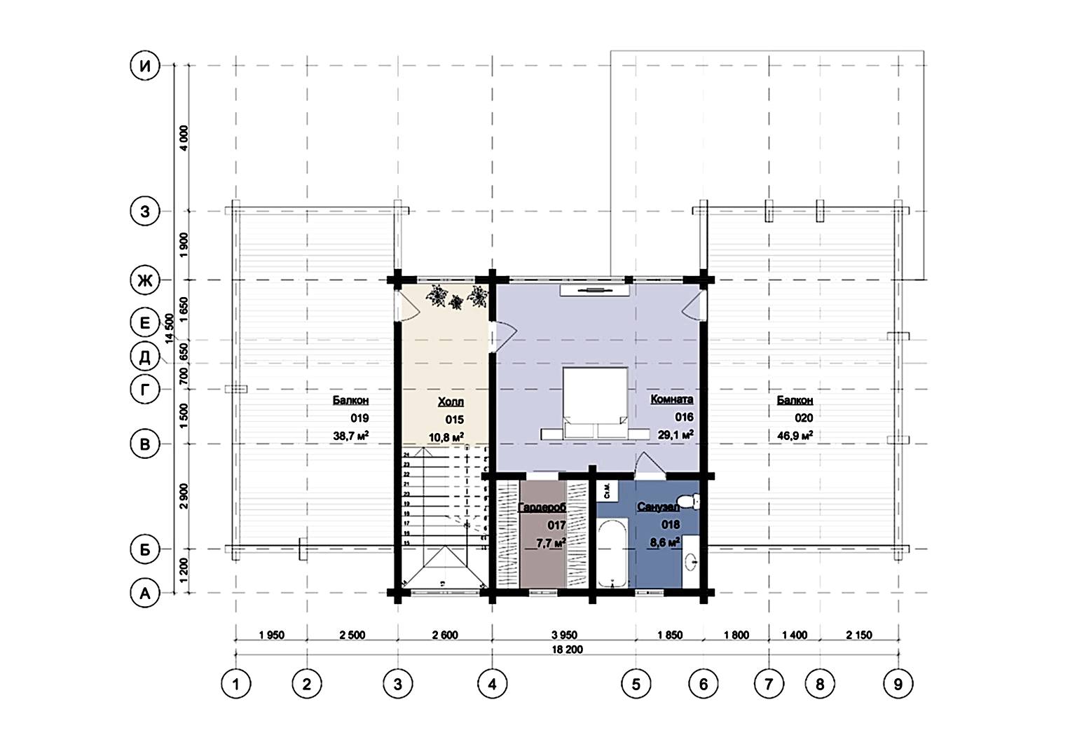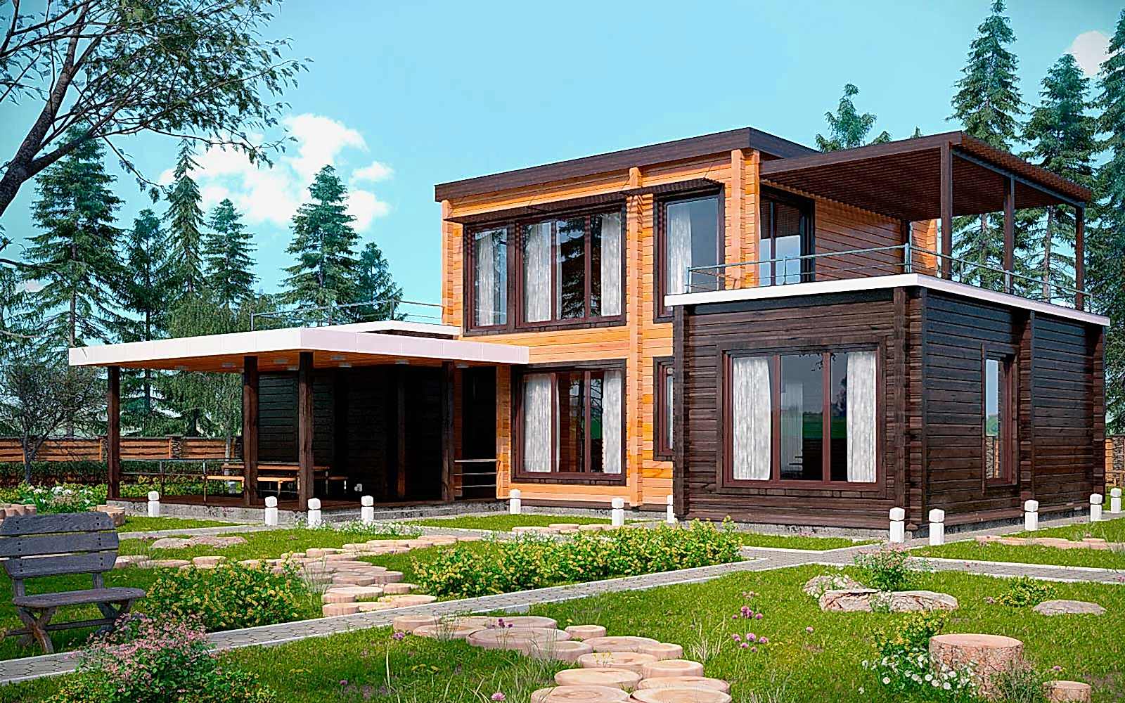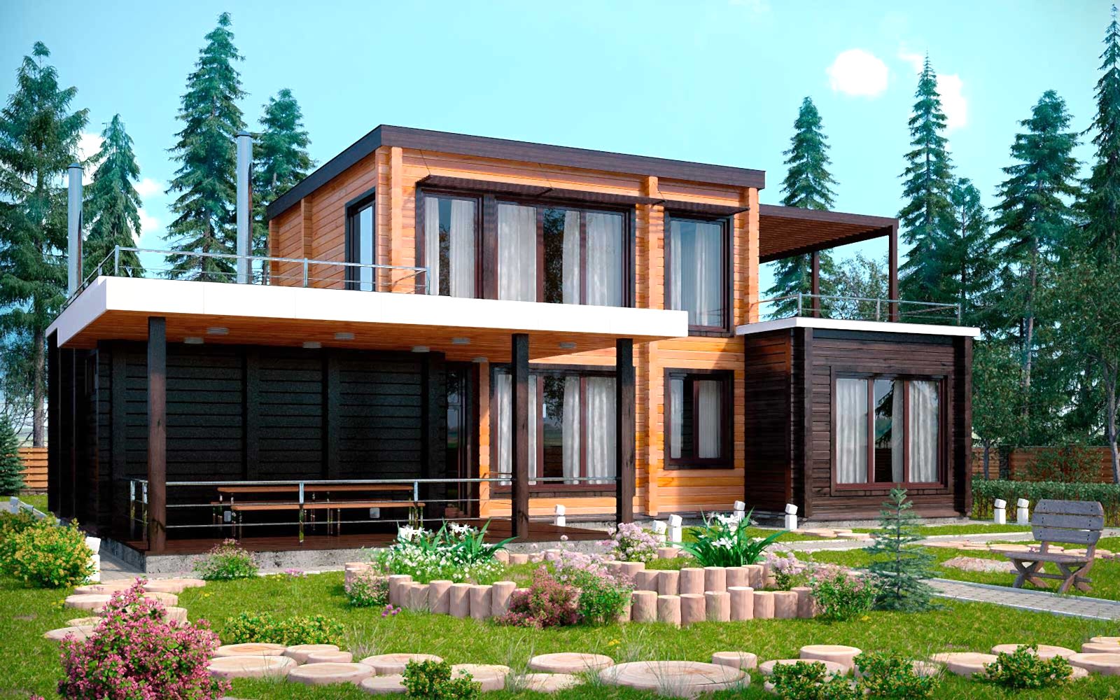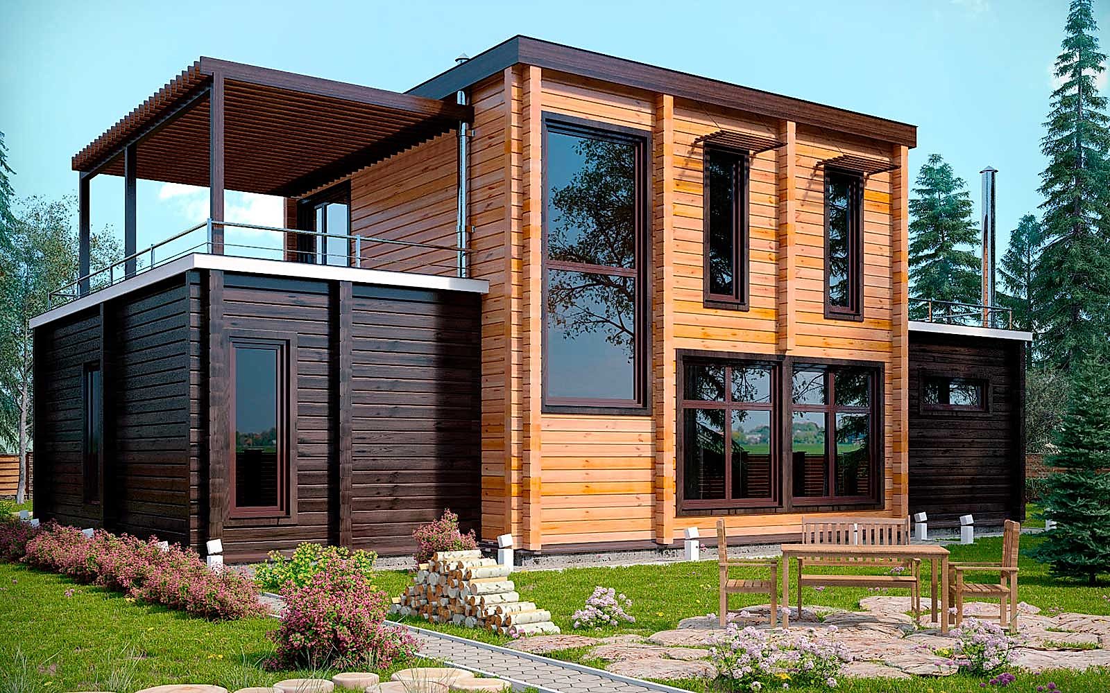 Просторный двухэтажный современный дом с плоской крышей. План первого этажа предусматривает кухню, большую гостиную-столовую, комнату для гостей, 2 холла, техническое помещение, 2 санузла, прихожую, 2 гардероба, душевую и парилку. Также постройка имеет вход со стороны тех. помещения и террасу с отдельным главным входом. На втором этаже - холл, одна большая спальная комната со своим санузлом и гардеробом, и 2 огромных балкона: 38.7 м2и 46.9м2.