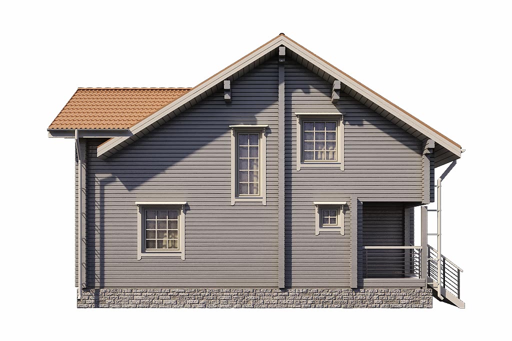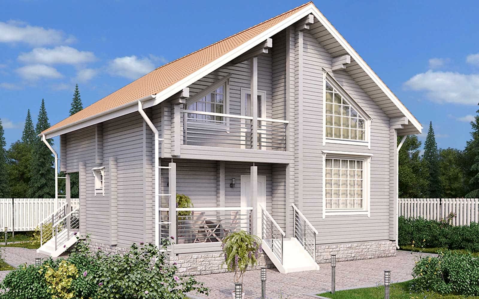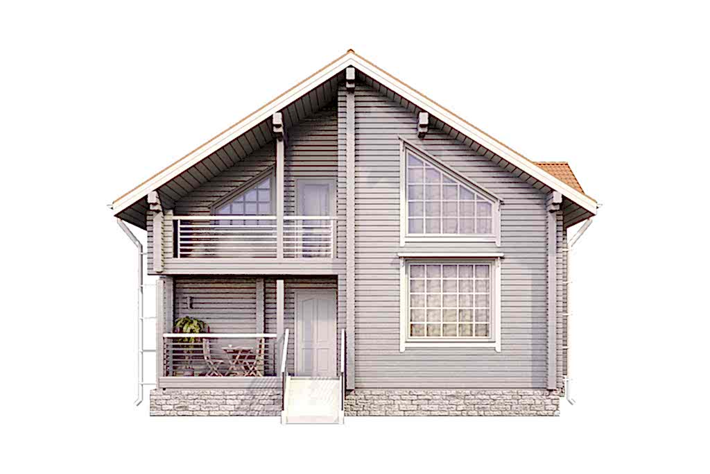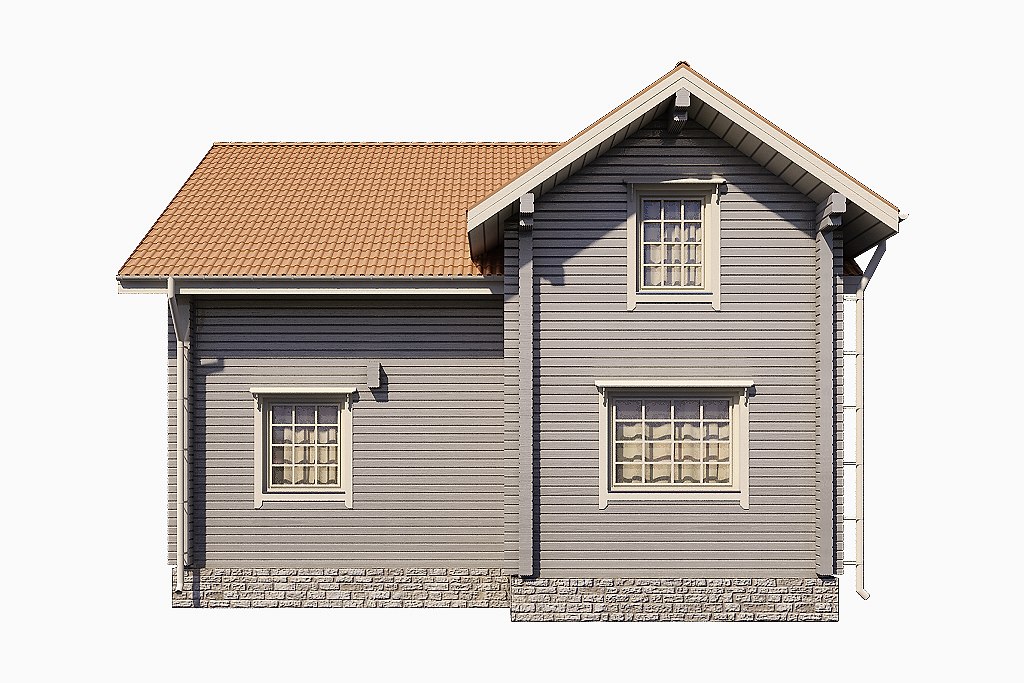 Небольшой двухэтажный жилой дом в финском стиле со вторым светом. План первого этажа предусматривает кухню-столовую, уютную гостиную, 2 тамбура, холл, техническое помещение, санузел и кладовую для хранения. Также постройка имеет 2 входа с крыльцом на каждом. На втором этаже расположены: 2 спальные комнаты, у одной из которых есть балкон, отдельный санузел на этаже, холл и комната отдыха, которую можно оборудовать, например в кабинет.