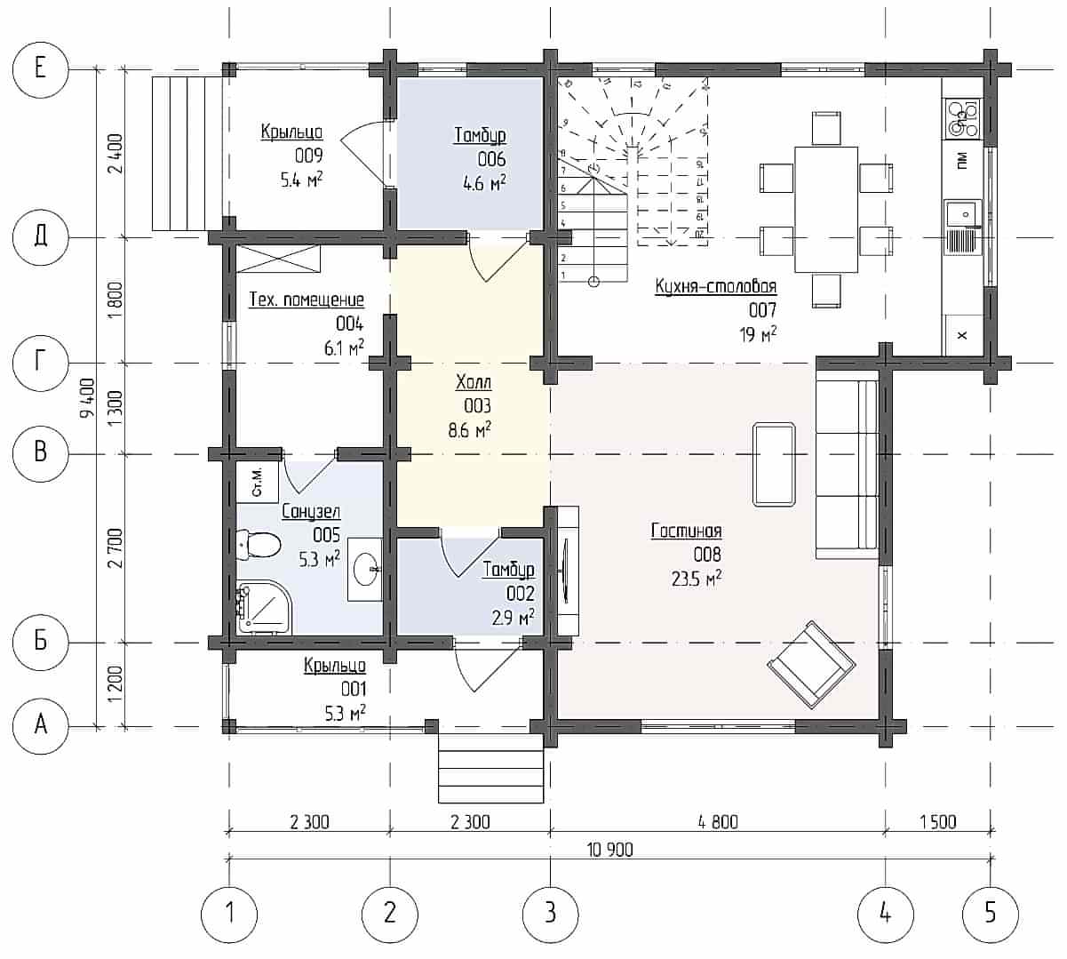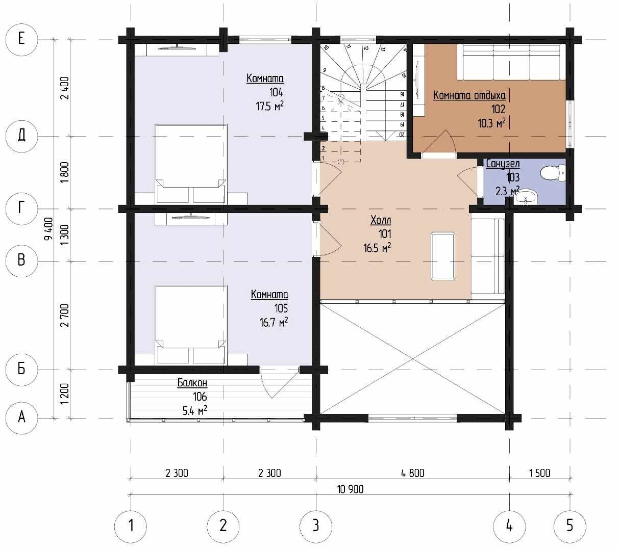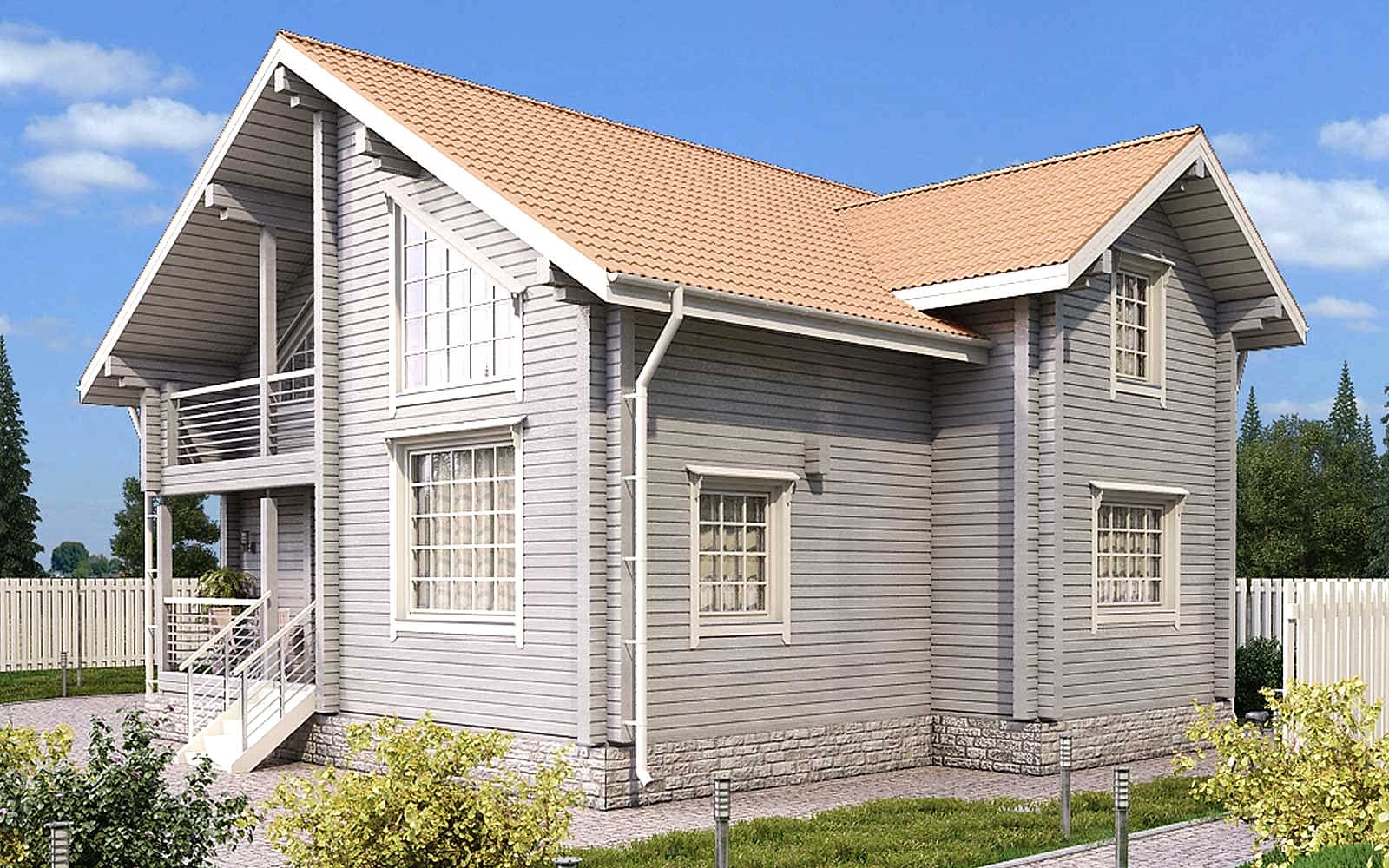 Небольшой двухэтажный жилой дом в финском стиле со вторым светом. План первого этажа предусматривает кухню-столовую, уютную гостиную, 2 тамбура, холл, техническое помещение, санузел и кладовую для хранения. Также постройка имеет 2 входа с крыльцом на каждом. На втором этаже расположены: 2 спальные комнаты, у одной из которых есть балкон, отдельный санузел на этаже, холл и комната отдыха, которую можно оборудовать, например в кабинет.
