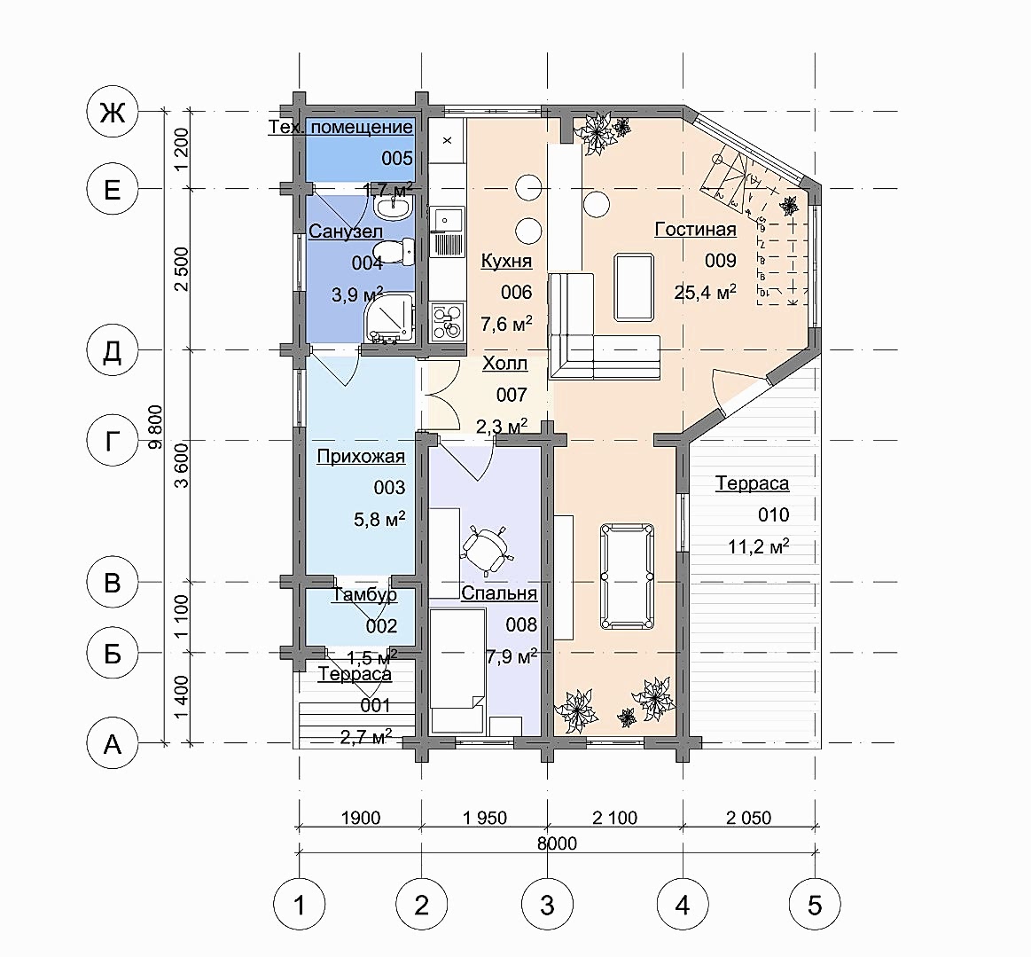 Уютный двухэтажный дом под ключ, выполненный в финском стиле. Подойдет как для отдыха, так и для постоянного места жительства. На первом этаже расположена большая гостиная комната, кухня, санузел, комфортная спальня, техническое помещение, тамбур, а также бильярдная, которую Вы можете использовать как комнату для отдыха. Планировка включает в себя 2 террасы с отдельными входами. Второй этаж включает в себя 3 удобных спальни (в одной из которых есть выход на балкон), гардеробную, отдельный санузел с ванной или душевой кабиной на выбор и просторный холл.