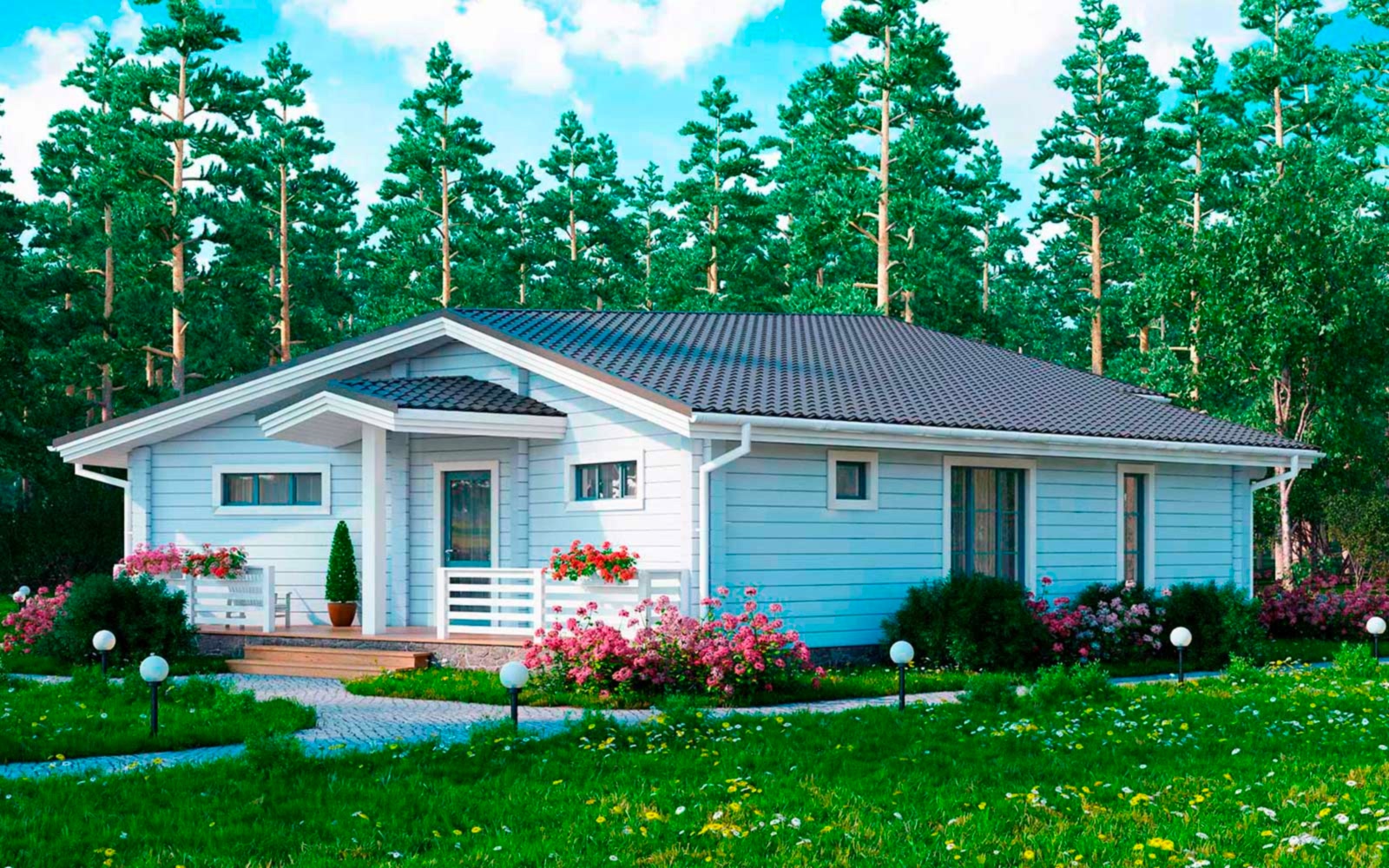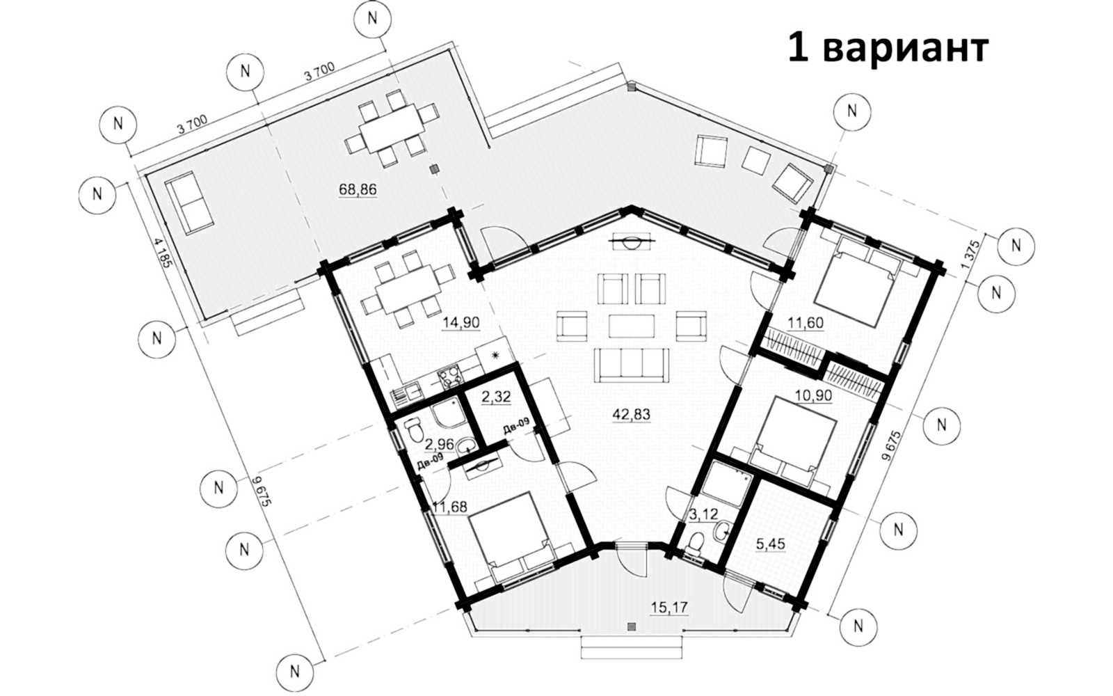 План здания предусматривает кухню-столовую, большую гостиную, три спальни, техническое помещение, два санузла, Pin Up