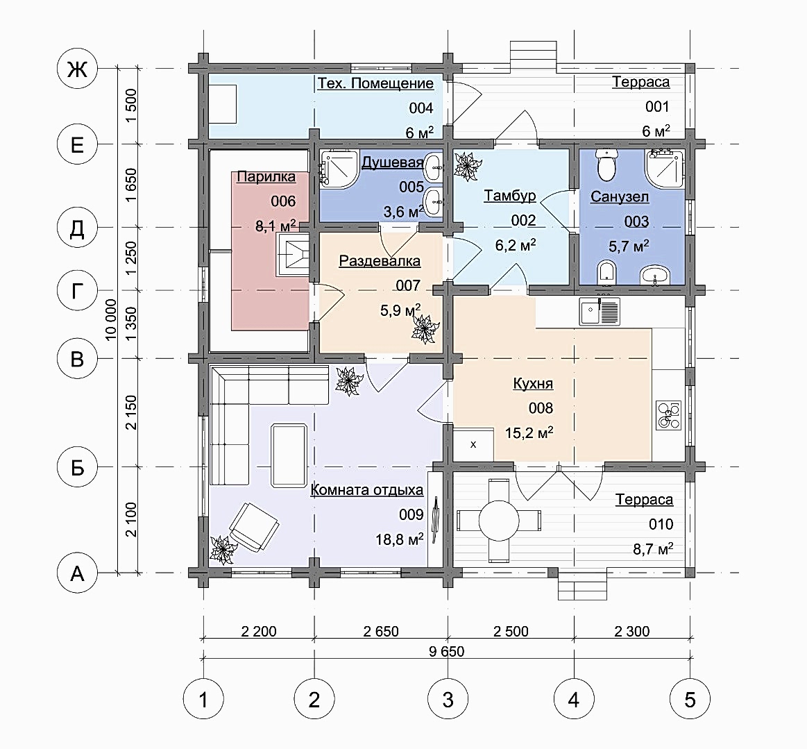 Баня «Осло» - отличная финская баня с кухней. План банного комплекса предусматривает 2 террасы, санузел, тамбур, тех. помещение, раздевалку, Pin Up кухню, просторную комнату отдыха и большую парильную зону.