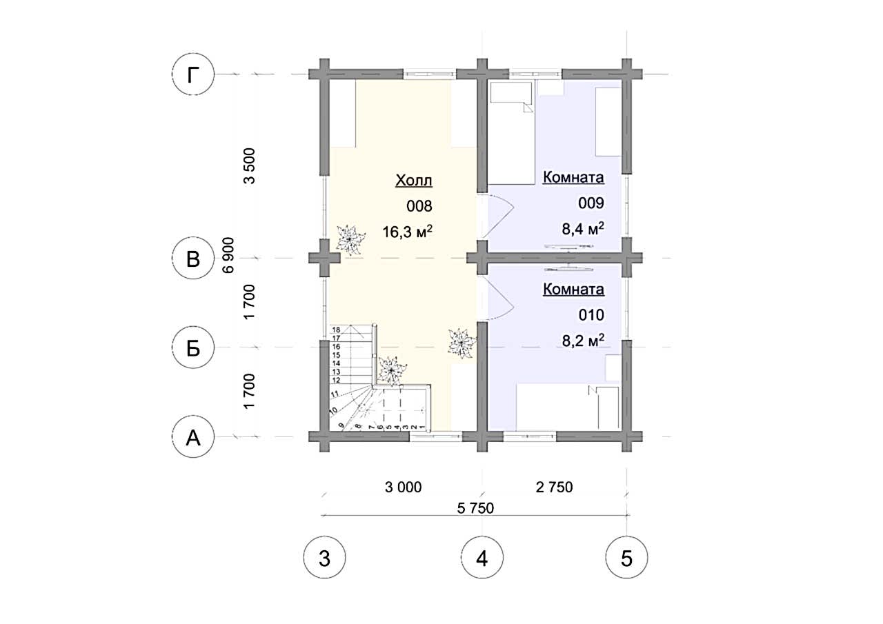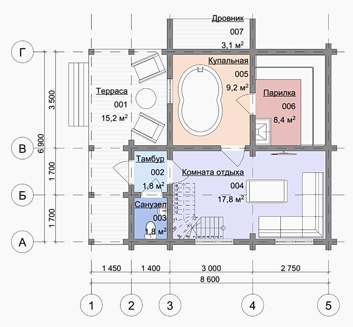 Баня «Вольфсбург» - двухэтажный банный комплекс с большой комнатой отдыха и купальной зоной. План Pin Up предусматривает террасу, парилку, дровник, тамбур и санузел на первом этаже. План второго этажа включает в себя холл и 2 просторные спальные комнаты.